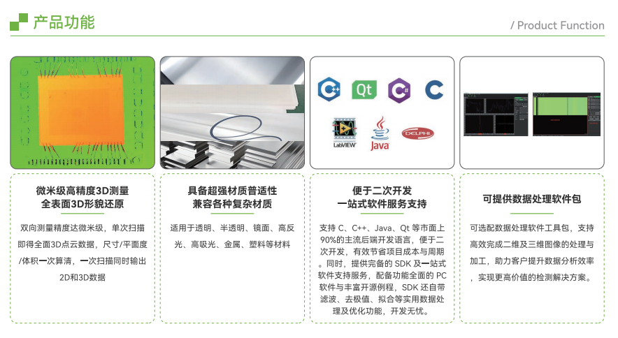 采用同轴结构设计,有效消除角度误差与环境光干扰。以线性扫描方式,能更好适应复杂材质检测,一次扫描即可提供多维度数据,大幅提升检测效率。